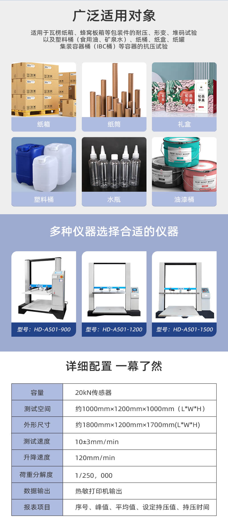 微電腦式紙箱抗壓試驗機是專業用于測試紙箱抗壓性能的試驗機,適用于瓦楞紙箱、蜂窩板箱等包裝件的耐壓、形變、堆碼試驗,以及塑料桶(食用油、礦泉水)、紙桶、紙盒、紙罐、集裝容器桶(IBC桶)等容器的抗壓試驗。